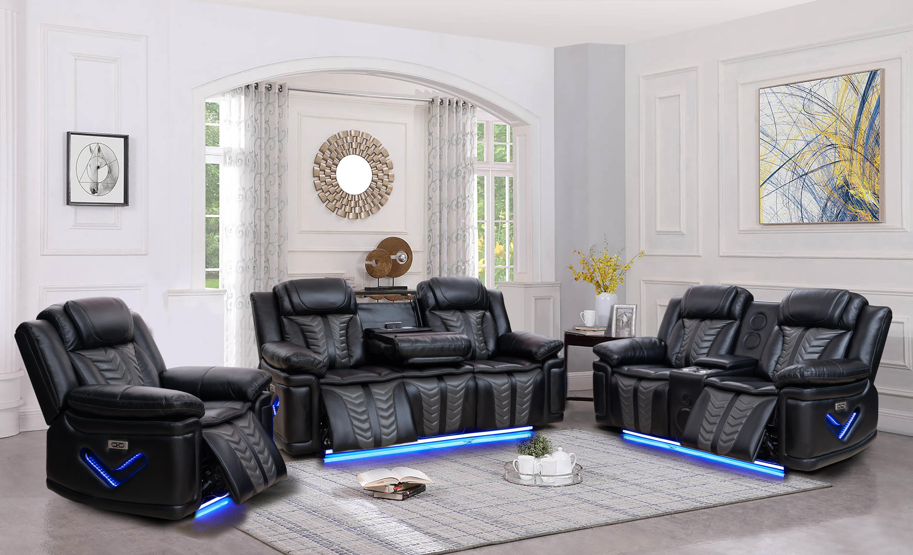 Modern 3-Piece Reclining Sofa Set. crafted in premium black leather with plush cushioning, LED base lighting, and built-in cup holders for a luxurious home-theater experience.