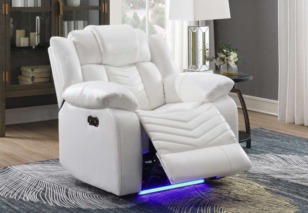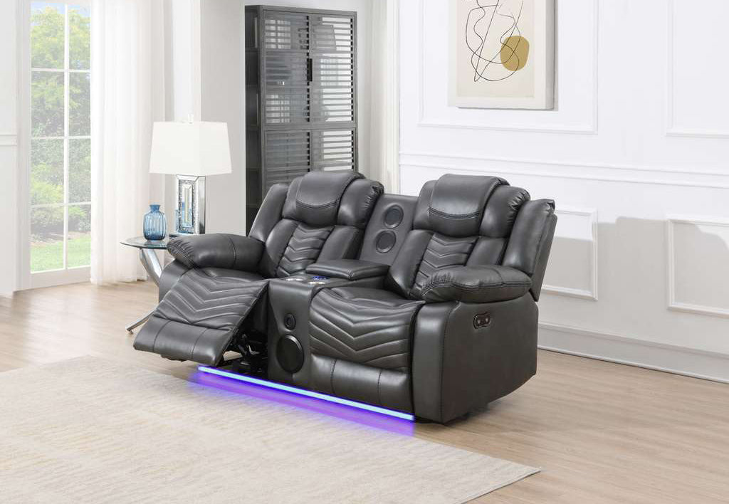Modern 3-Piece Reclining Sofa Set. crafted in premium black leather with plush cushioning, LED base lighting, and built-in cup holders for a luxurious home-theater experience.