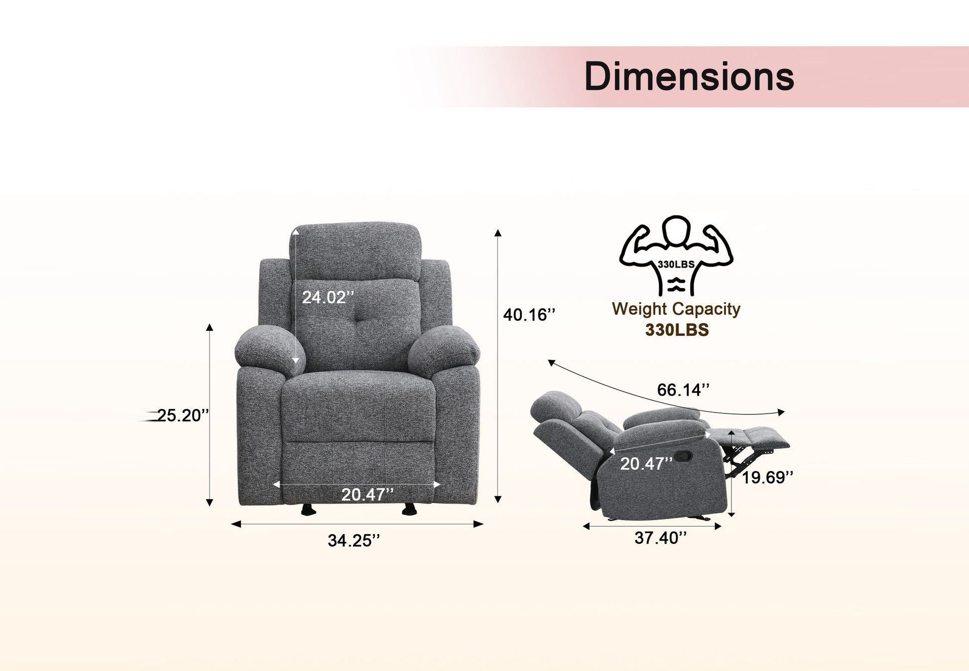 Recliner Chair: 34.25"W x 37.40"D x 40.16"H (Fully Reclined: 66.14"L)