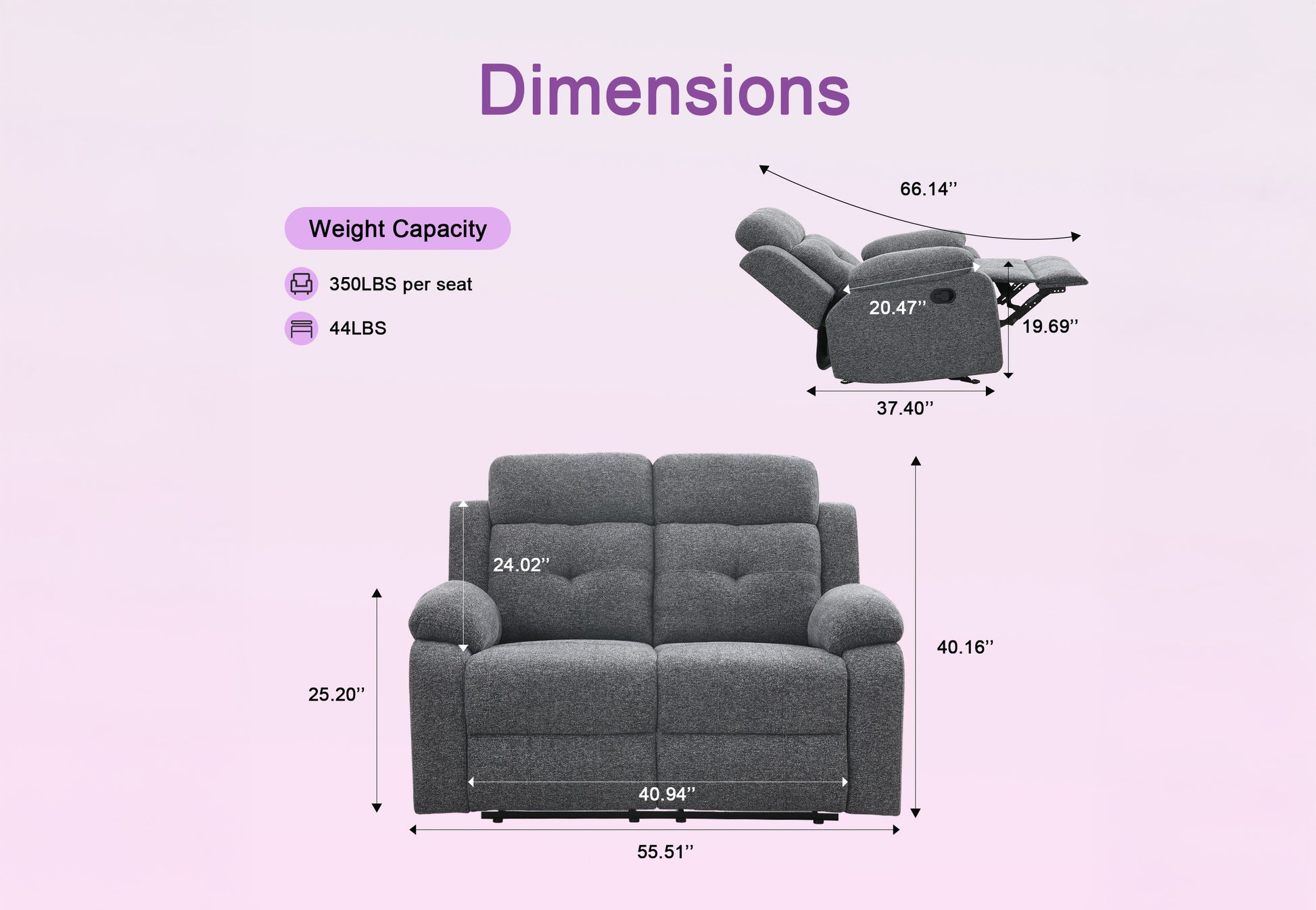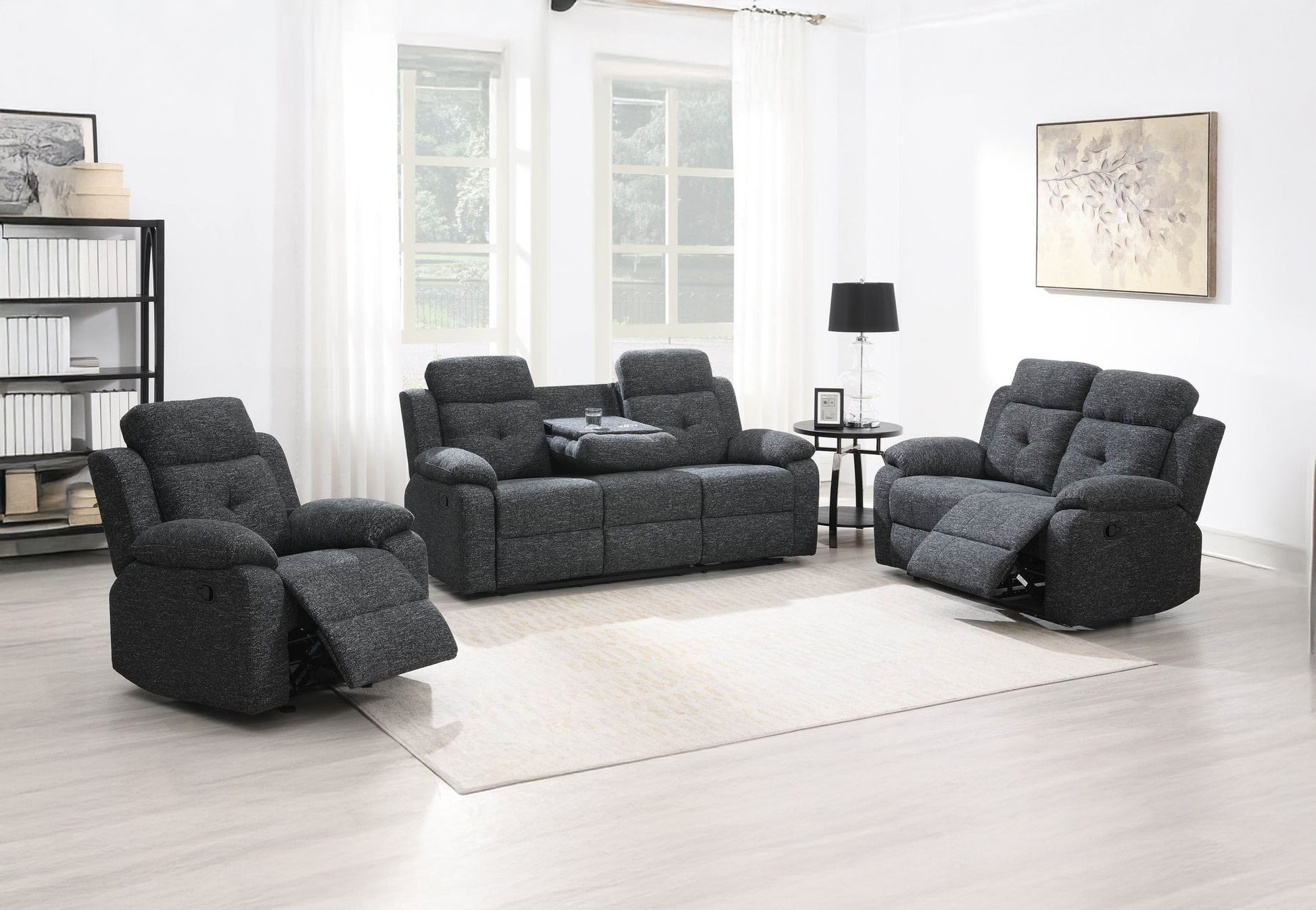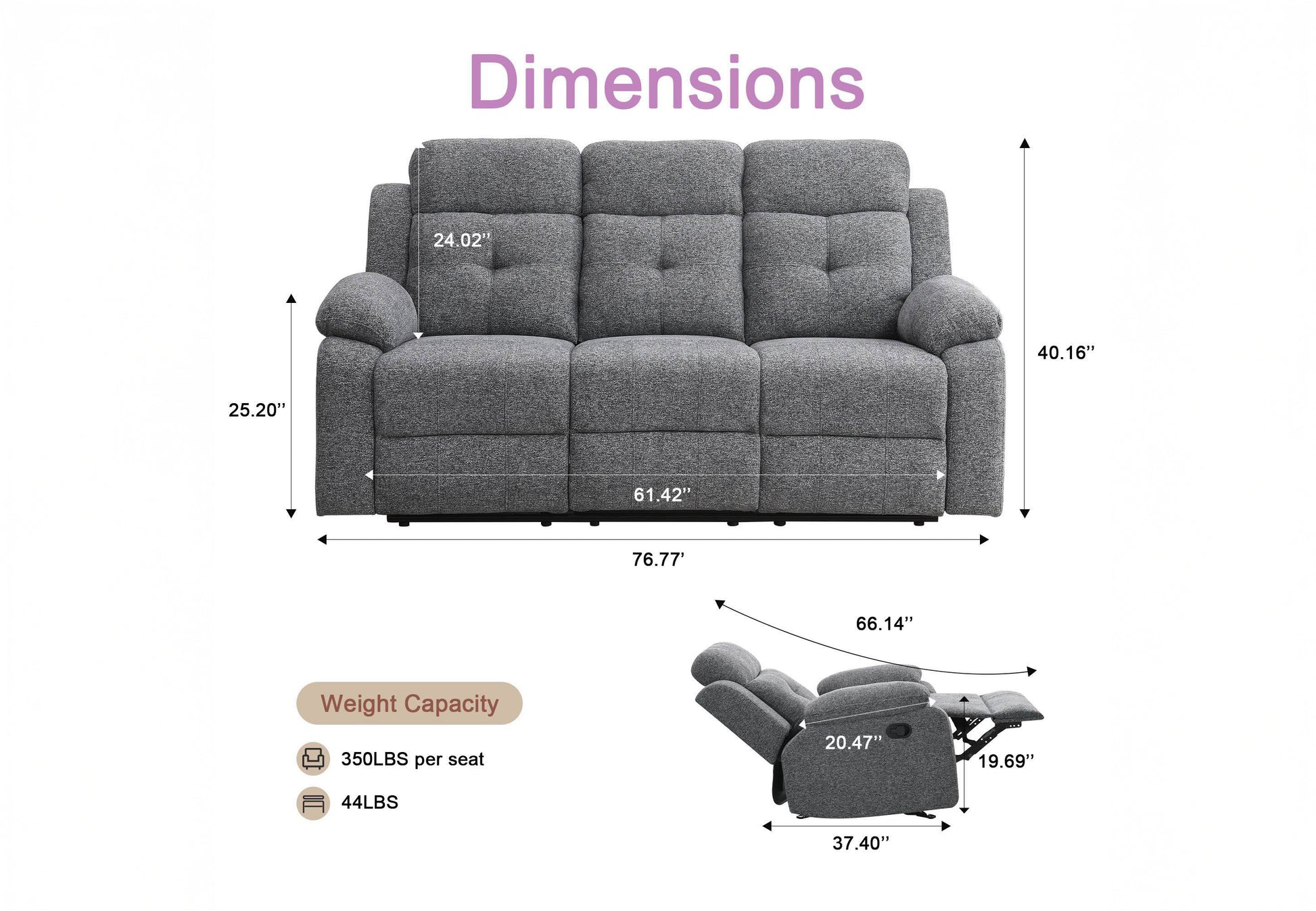 Transform your living space with this modern 3-piece reclining set featuring a sofa, loveseat, and recliner chair. Upholstered in soft, textured gray fabric, this set offers plush comfort, built-in cup holders, and manual recline functionality—perfect for relaxing, entertaining, or movie nights.