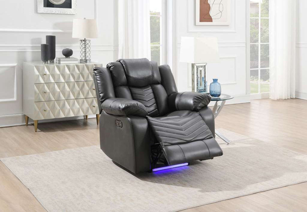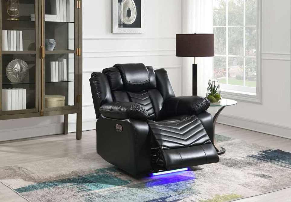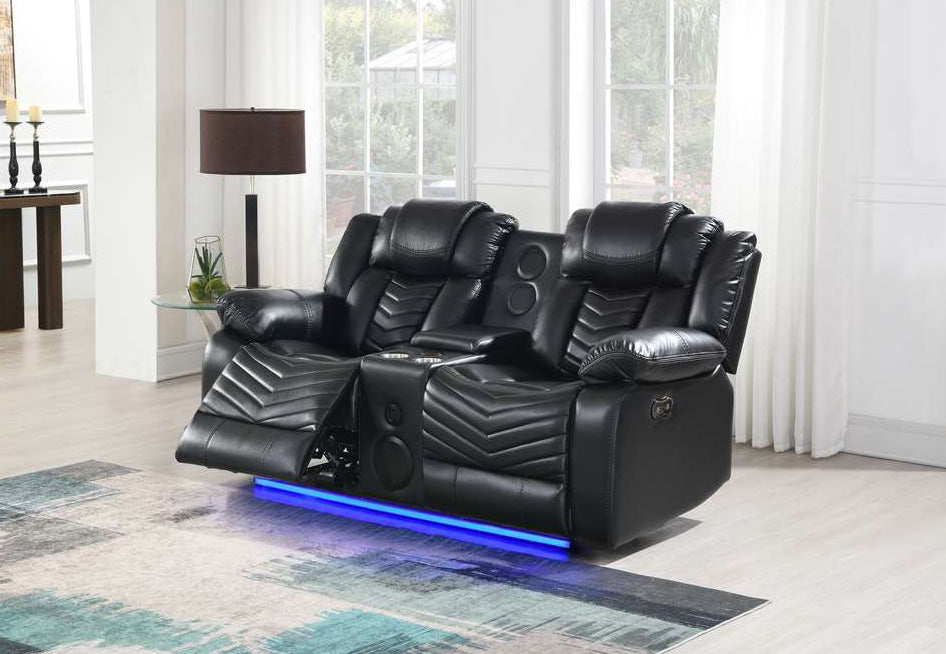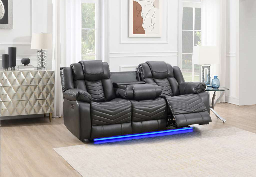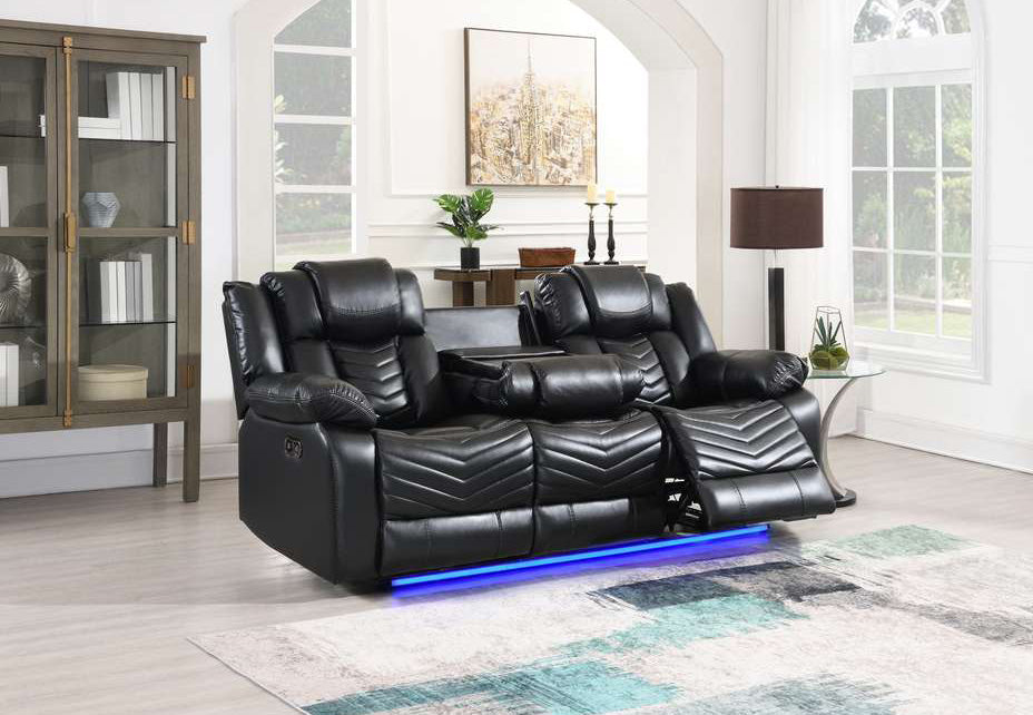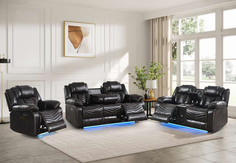 Modern 3-Piece Reclining Sofa Set. crafted in premium black leather with plush cushioning, LED base lighting, and built-in cup holders for a luxurious home-theater experience.